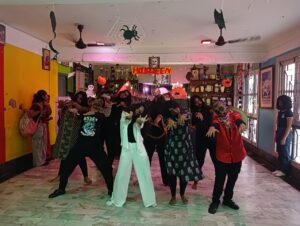 The corridors displayed a beautiful mix of spooky and traditional art — clay jack-o’-lanterns beside terracotta masks, spider webs woven with alpana motifs — symbolizing the event’s cultural fusion.