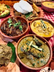 For non-vegetarian indulgences, there’s Katla Bhapa, Aar Maacher Tel Jhol, Chicken Rezala, Dhonepata Kancha Lonka Murgi, Kasha Mangsho, Murshidabadi Murgi, Kalo Bhuna Mangsho, and Faridpuri Marich Mangsho.