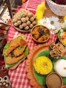 The feast continues with a hearty line-up of mains such as Gobindo Bhog Ghee Bhaat, Dhakai Sabji Pulao, Basanti Pulao, Pudina Laccha Paratha, and Radhaballavi. Vegetarian favourites include Mohini Moong Dal, Shuktoni, Aloo Jhinga Posto, Mochar Ghanto, Chanar Paturi and Potoler Dolma.