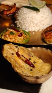 Thalis begin with a summer special Bel Panna Sorbet. It is followed by Gandhoraj Kasundi salad, Jhuri Aloo Bhaja, Begun Bhaja, Sona Moong Dal, and Lau Bori with Narkel.