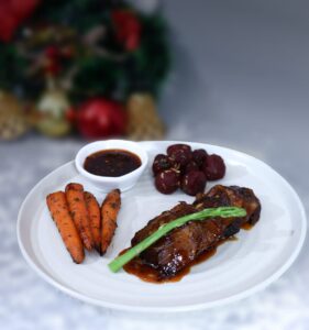 Roasted Duck in Chilli Plum Sauce accompanied by honey-roasted carrots and spiced beet balls – ₹825