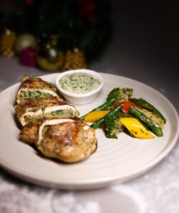 Spinach & Artichoke Chicken Wellington paired with tossed vegetables – ₹475