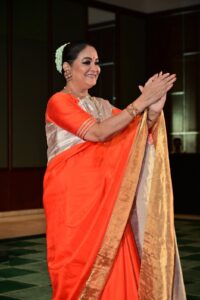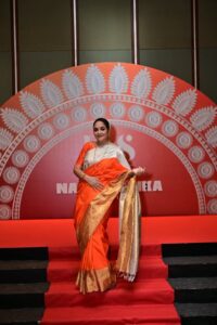 Dr. Rupali Basu is seen wearing a bright orange Kanjivaram saree with beautiful silver and gold borders. The colour orange stands for devotion, strength, and change – just like the powerful and caring nature of Maa Durga. Her saree is not just something she wears; it tells a story of India’s rich handloom tradition.