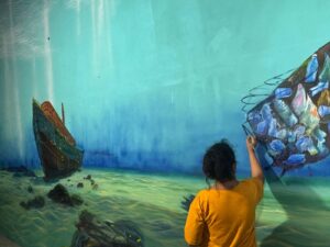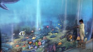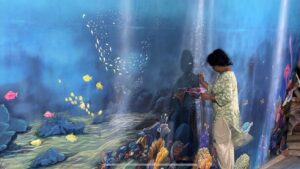 Inside, visitors are transported into a deep-sea sanctum, where devotion plunges beneath the surface. The pandal transforms into an underwater world, complete with coral palaces, floating fish, and dancing dolphins – each element evoking ancient temples long submerged in time. Amidst this visual splendour, a tiny boat sails quietly, collecting plastic and waste, a gentle yet powerful reminder that true worship is incomplete without caring for Mother Earth.